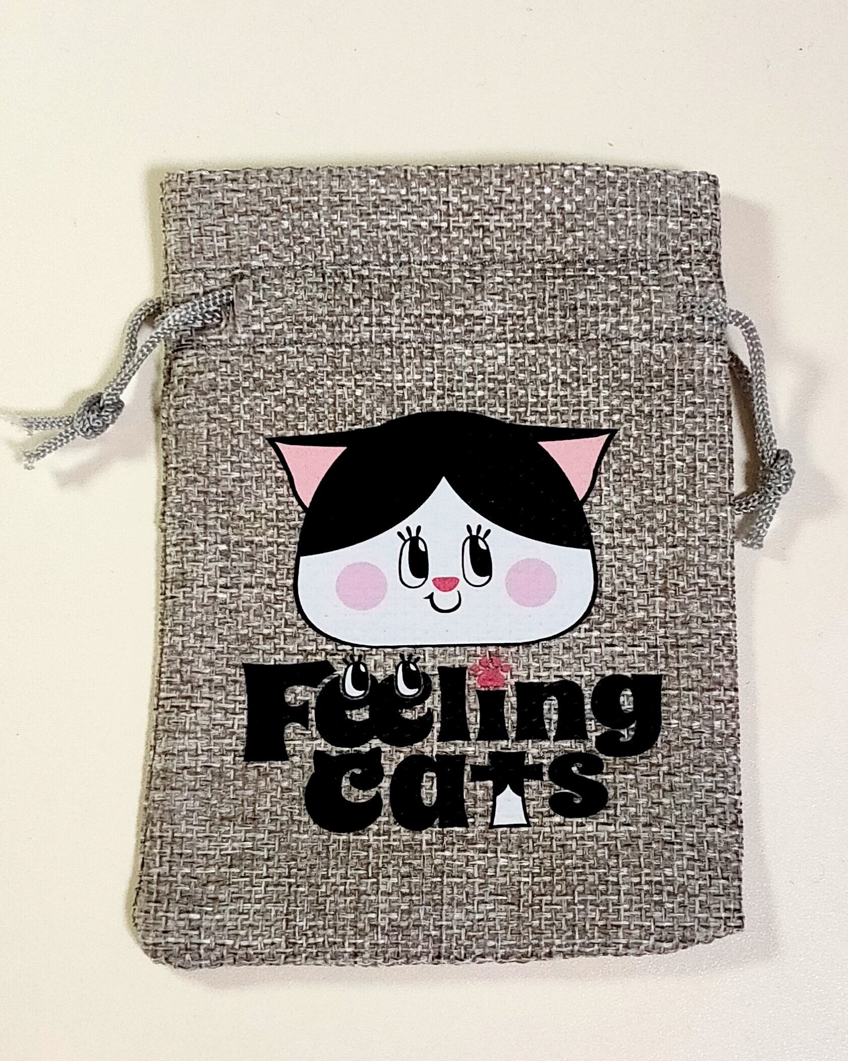 フィーリングキャッツロゴとサティを小さな巾着に印刷。サティフィギュアの入れ物にもいいかも♪