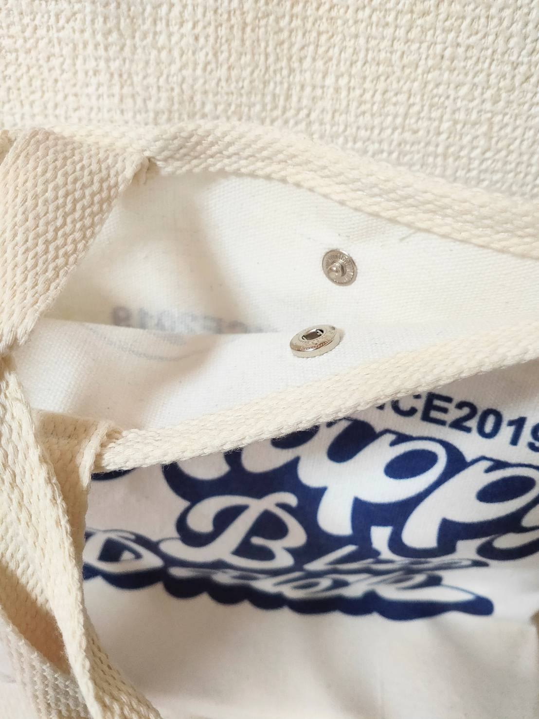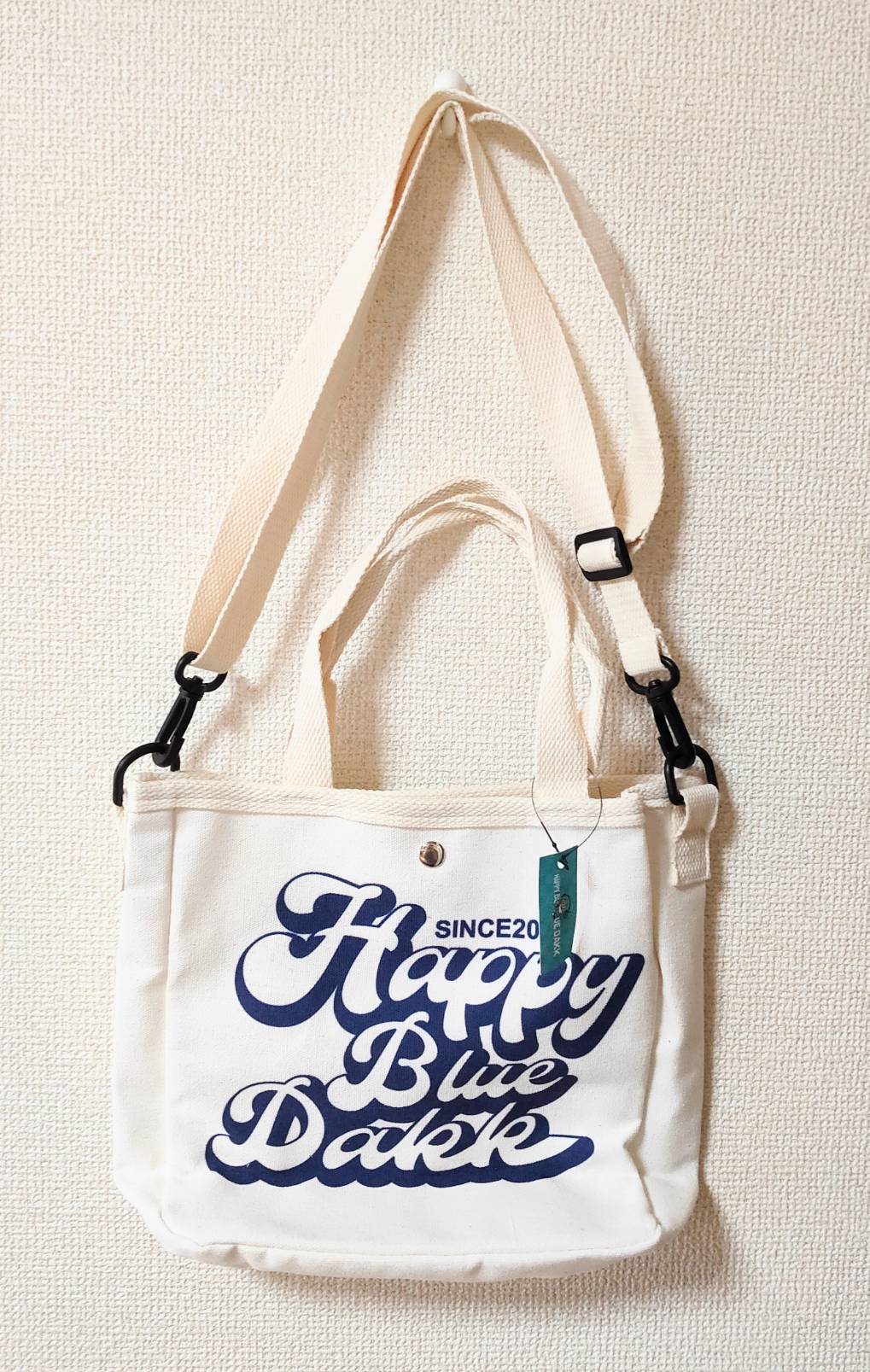 オールロゴ白バッグのネイビープリントです。