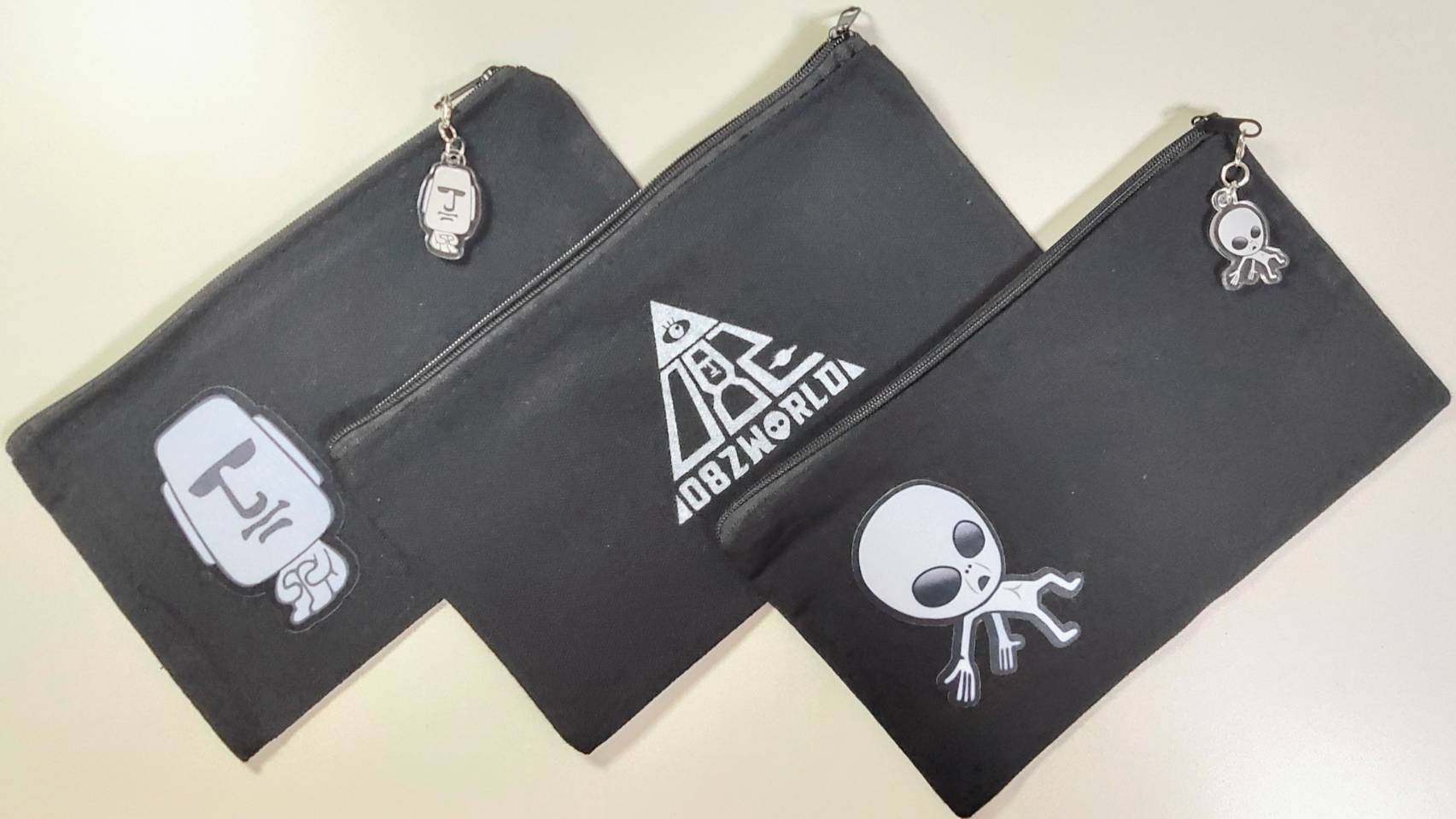 裏面はミステリアスロゴの印刷で、アクリルチャームもモアイのポーチにはモアイ、グレイのポーチにはグレイのアクリルチャームが付いています。